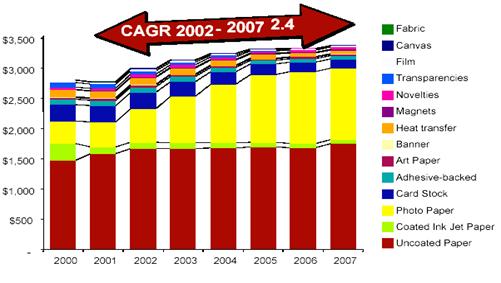 統(tǒng)計數(shù)據(jù)表明,美國家用電腦和打印機的普及培育了桌面噴墨打印的市場,2004年噴墨方式輸出的1160億張打印紙中,特殊打印介質(zhì)將近300億張,預(yù)期2002年至2007年間普通噴墨打印紙和特殊打印介質(zhì)均會有穩(wěn)定增長,這段時間內(nèi),噴墨打印介質(zhì)的打印數(shù)量年度遞增率(CAGR)為3.5%。2004年美國整個噴墨介質(zhì)的收入超過32億美元,其中普通產(chǎn)品約17億美元,透明片或其它膠片薄膜產(chǎn)品0.5219億美元,特殊打印介質(zhì)超過13億美元。雖然普通產(chǎn)品(commodity)仍是噴墨打印的主要輸出對象,數(shù)量上占了總噸數(shù)的75%,但由于價格低,其銷售額只占總銷售額的40%。 2005年預(yù)期桌面噴墨打印的總量將超過1202億張,市場份額33億美元。2002-2007年間預(yù)期噴墨打印紙的銷售額年遞增率2.4%。特殊打印介質(zhì)包括彩噴紙(Coated paper),照片打印紙(Photo paper),明信片紙,背膠,油畫紙,標(biāo)簽紙等等。在特殊打印介質(zhì)的增長中,彩噴紙的增長速度相比較慢,而照片打印紙增長速度很快,預(yù)計2002-2007年間照片打印紙的年遞增率將高達16%!這種增長歸功于低價位數(shù)碼相機的熱銷;低于50美元打印機的銷售;和數(shù)字圖像傳輸?shù)目旖菪浴?/span>