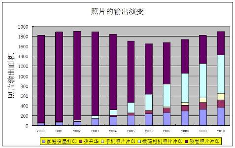隨著數碼相機的普及,盡管照片的拍攝量每年都在成倍增加,但是照片的輸出量進十年來一直徘徊不前,電腦、數碼相框、手機、Ipad等的不斷普及,使人們對于照片印出的需求銳減,但照片輸出絕對量并沒有明顯減少,畢竟,實物照片是液晶屏幕不可完全取代的。