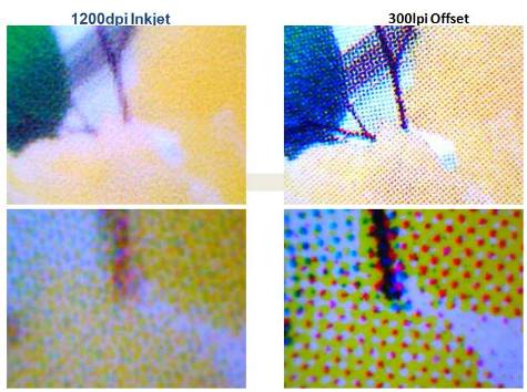 其實純就質量而言,凸版印刷與數碼噴墨印刷相比也是各有千秋,噴墨的圖像過渡和文字邊沿更加平滑,但是銳度比凸版印刷要差,我們知道,噴墨印刷品質首先取決于墨點的大小和噴頭的物理分辨率,盡管受到噴頭的限制,但還是其他途徑進一步提升印刷品質。
