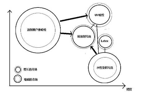 1. 70寸以上的巨幅噴繪市場(Ultra-wide printer),大多數為溶劑墨水(solvent ink),也叫"戶外噴繪"或者"大噴"。現在市場也有部分用UV 墨水的卷到卷機器,用在戶外廣告噴繪方面。