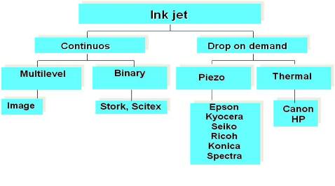噴墨技術分為連續噴墨和按需噴墨(DOD)兩種,前者目前只用在柯達的數字印刷機上,市場上的絕大部分噴墨打印機都屬于按需噴墨技術,按需噴墨又分為壓電和熱發泡兩類,熱發泡噴頭廉價、精度高,但其缺點也是顯而易見的:噴頭壽命短、只適用水性墨水,因之主要用于家庭和辦公室的紙張打印;而壓電噴墨是利用陶瓷加上電壓后會變形的原理,直接將電壓轉換為機械壓力,工作在常溫下,也無需溶解在水中的氧氣幫忙,所以不但噴頭壽命長,而且可以適用各種類型溶劑所生產的墨水。