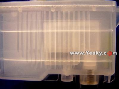 無海綿墨盒側面圖,里面有一個墨水壓力平衡倉,可以起到平衡墨水的作用,使得打印頭承受的壓力更為均衡。