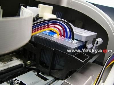 通過這樣的設計,可以使用墨盒所帶的原裝的墨盒蓋,這樣使得系統的穩定性進一步提高,另外這種走線也可以讓打印機的蓋子蓋上有效的防塵,提高打印機的使用壽命和打印質量