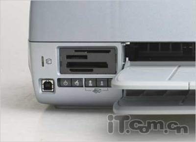 對(duì)于照片打印機(jī)來(lái)說(shuō),最重要就是它一般都設(shè)計(jì)內(nèi)置了數(shù)據(jù)讀卡單元,能夠在不連接計(jì)算機(jī)的情況下,可直接讀取數(shù)碼相機(jī)存儲(chǔ)卡中的照片數(shù)據(jù)并進(jìn)行打印。可以從圖中看到,在Photosmart 7268前面板上提供的一組存儲(chǔ)卡插槽,這一組存儲(chǔ)卡插槽,能夠直接讀取CompactFlash、SmartMedia、Secure Digital、多媒體卡以及記憶棒等主流類型的存儲(chǔ)介質(zhì)。另外在插槽旁邊也提供了提供了打印10×15cm照片和打印照片拼頁(yè)的按鍵,接讀取數(shù)碼相機(jī)存儲(chǔ)卡中的照片數(shù)據(jù)并進(jìn)行打印。